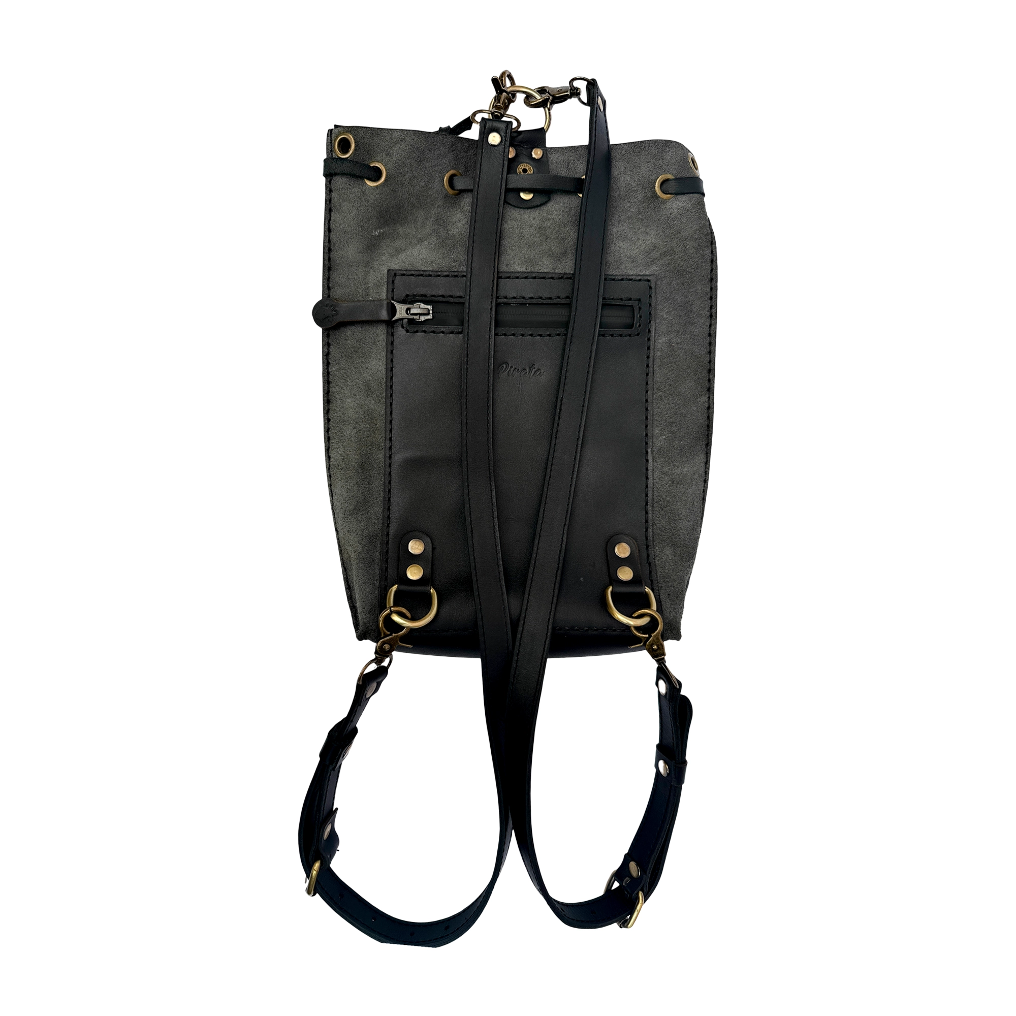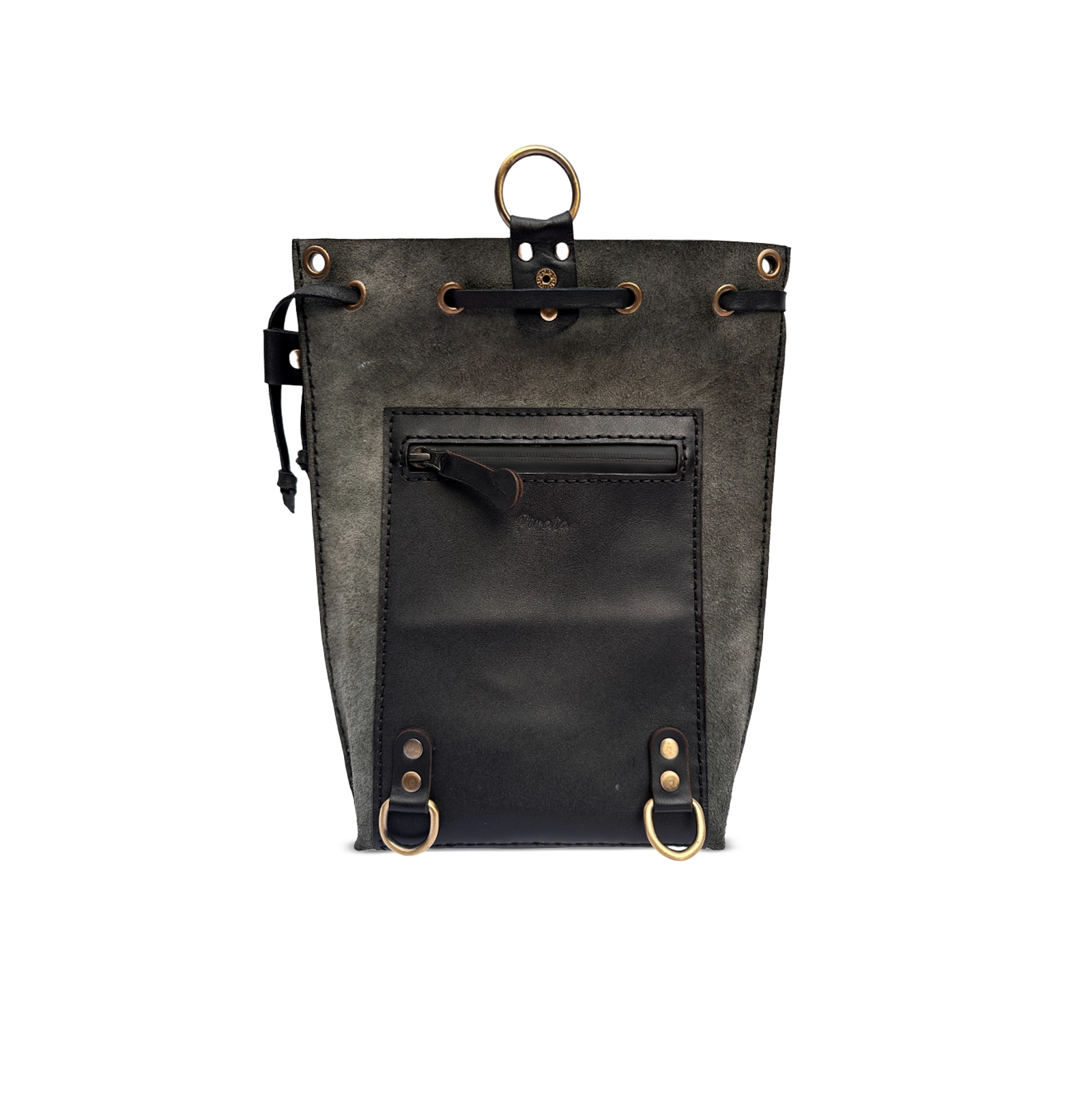 Its unlined interior preserves the raw character of the leather, while front and back zip pockets keep your essentials secure and within reach. A drawstring closure with a snap-button finish adds both function and structure, creating a clean silhouette that adapts effortlessly to your movement.